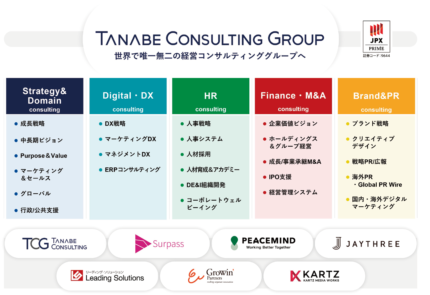 1957年創業の日本の経営コンサルティングのパイオニアで、純粋持株会社である株式会社タナベコンサルティンググループは東証プライム市場に上場。国内外の大企業から中堅企業・中規模企業のトップマネジメントを主要顧客に、創業以来18,900社以上の支援実績を有する。経営戦略の策定からDX等による現場での経営オペレーションの実装・実行まで、経営の上流から下流までを一気通貫で支援するチームコンサルティングを提供する。2025年5月にJ-Adviser資格を取得。10事業所から全国の中堅企業・中規模企業に対して、持続的成長へ向けてのIPOという選択肢を提案する。